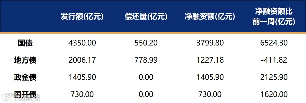 国债、国开、政金债、地方债发行量、偿还量、净融资额(与前一周比较)。