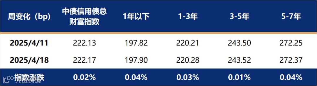 上周,信用债收益率变化不大,中债信用债总财富指数微涨0.02%,其中1年以下、5-7年指数涨幅相对较大。