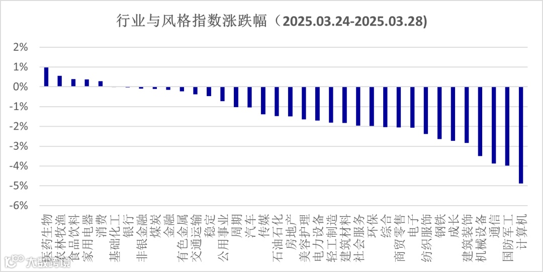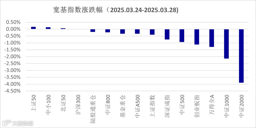 上周A股前四个交易日呈现震荡走势,宽基指数虽有分化,但仍有半数上涨。上周五上证综指低开低走,全天下跌0.67%,万得全A下跌0.80%,在此影响下,上周涨幅最高的上证50仅上涨了0.16%,而表现较差的中证2000指数跌幅达到3.90%。经过春季躁动后,市场进入了政策推动和业绩验证阶段,前期依赖主题推升的概念板块回调幅度较大,业绩预期较高的蓝筹股在3月份表现相对较好。上周A股市场成交量进一步下降,万得全A指数的日均成交额为1.26万亿,反应市场的交易热情下降。