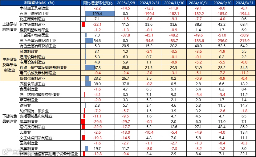 从产业链的角度分析,规模以上工业企业的利润呈现出明显的上下游分化特征。具体而言,上游和下游的利润同比增长仍然有较大压力,普遍呈现负增长特征,而中游行业的利润增长相对较好。
