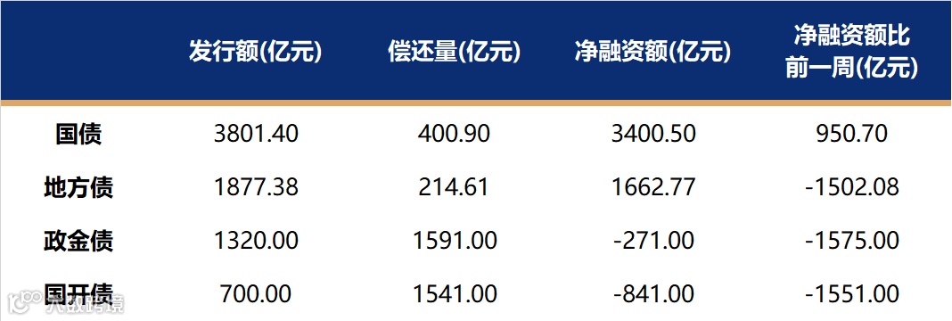 国债、国开、政金债、地方债发行量、偿还量、净融资额(与前一周比较)。