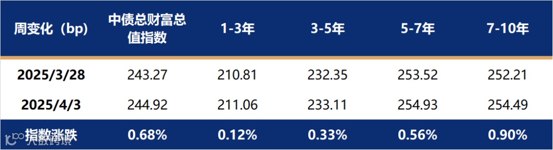上周债市收益率先小幅回升后大幅下行,全周看各期限收益率均大幅下行,其中长端、超长端下行幅度大于短端,曲线由陡转平。影响上周债市大幅走强的原因是4月2日公布的美国最新关税政策大超市场预期,引发全球风险资产全面调整,国内对于出口将受到较大的冲击,央行降准降息预期大幅提升,债市收益率大幅度下行。截至4月3日,1年期国债收益率报在1.4829%,较3月28日下行4.50bp;10年国债收益率报在1.7180%,较3月28日下行9.46bp。中债总财富指数大涨0.68%,7-10年指数涨幅相对较大。
