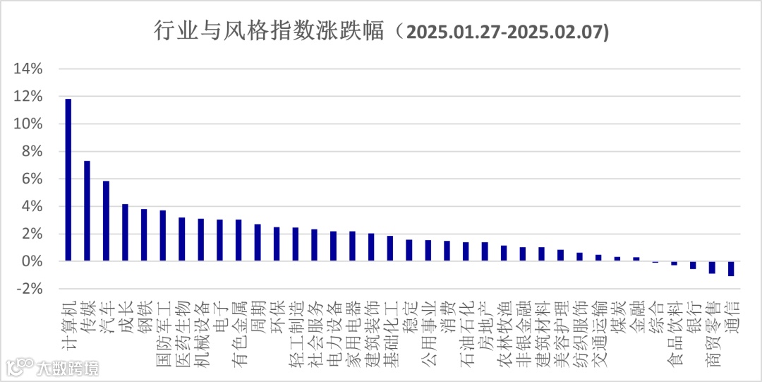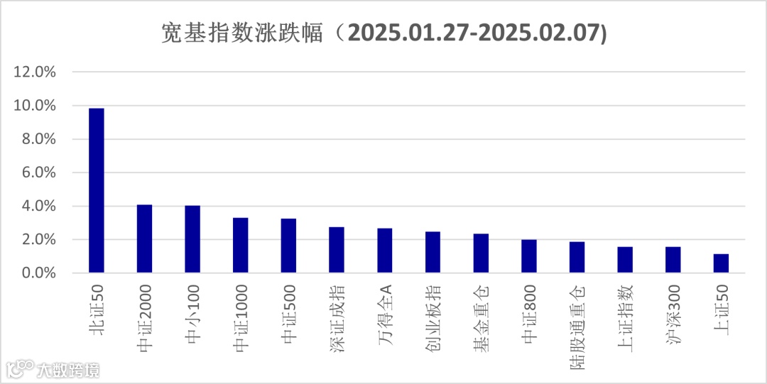 上周及节前一个交易日的A股走势,呈现先抑后扬的态势。春节前后的两个交易日市场风险偏好降低,但随后在概念板块带动下持续拉升,人工智能和机器人概念开始扩散, Wind概念指数为例,节日后三个工作日内,人工智能指数涨幅达11.7%,人形机器人指数涨幅达到9.8%,显示较高的板块热度。在概念指数和风格影响下,小盘股明显跑赢市场整体,北证50指数累计上涨了9.8%、中证2000、中证1000指数涨幅均超过4%,蓝筹股表现稍弱,上证50指数涨幅仅有1.1%。市场成交量逐步放大,节后三个交易日万得全A的成交额均值,已经回升到1.6万亿,两融余额也呈现持续的回升态势。