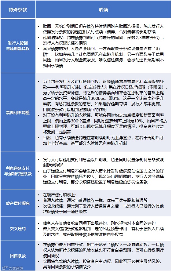 永续债的特殊条款,主要包括发行人赎回与延期选择权、利率跳升机制、递延支付利息权、破产偿付顺序、交叉违约、回售条款等: