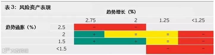 这些情景对资产表现意味着什么?在表3中,我们使用宏观因子分析框架预测资产表现。在表3的左上方,金融条件收紧可能导致风险资产表现不佳。在右下方,低增长可能导致风险资产表现不佳。我们的基本假设情景(趋势增长和通胀均为2%)表示短期之内的风险表现呈中性。然而,如果增长暴跌(低于1.25%),或通胀飙升(2.5%),预期风险资产将表现逊色。