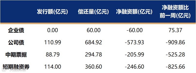 非金融企业短融、中票、企业债、公司债发行量、偿还量、净融资额(与前一周比较)