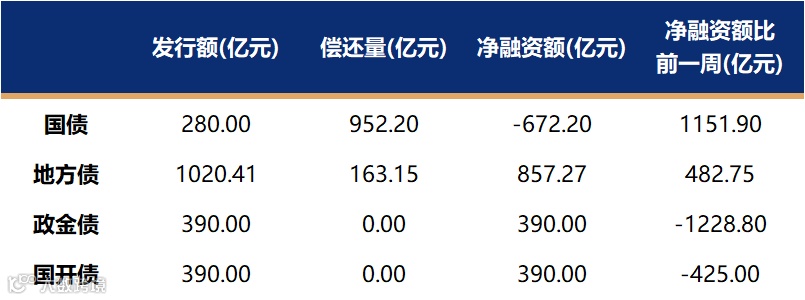 国债、国开、政金债、地方债发行量、偿还量、净融资额(与前一周比较)。