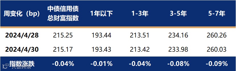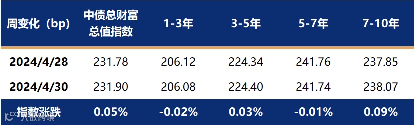 上周仅有两个交易日,经过前一周的收益率加速上行,利率债交易情绪在周一午后有所企稳,周二因央行公开市场投放加量呵护流动性,公布的4月PMI数据环比回落,政治局会议落地多重利好下,利率债收益率在周二大幅回落。截止至4月30日,1年期国债收益率报在1.6928%,较4月28日下行0.04bp;10年国债收益率报在2.3028%,较4月28日下行2.16bp,再度接近2.30%关键点位。中债总财富指数微涨0.05%,其中7-10年指数涨幅稍大,其余期限指数和前一周变化不大。
