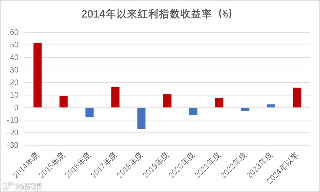 注:2016、2018、2022、2023年度与2024年以来,万得全A收益率分别为-12.91%、-28.25%、-18.66%、-5.19%、-0.22 %,红利指数相对万得全A的超额收益分别为5.34%、11.38%、11.29%、16.23%、7.86%、16.05%。