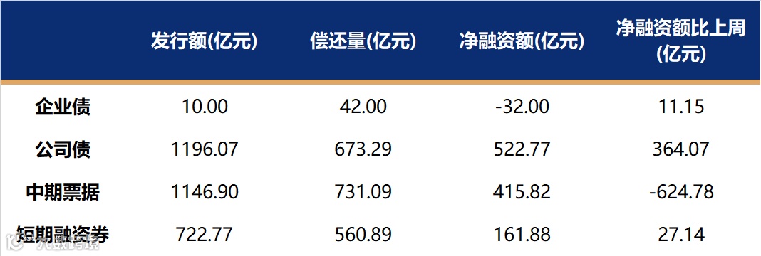 非金融企业短融、中票、企业债、公司债发行量、偿还量、净融资额(与前一周比较)。