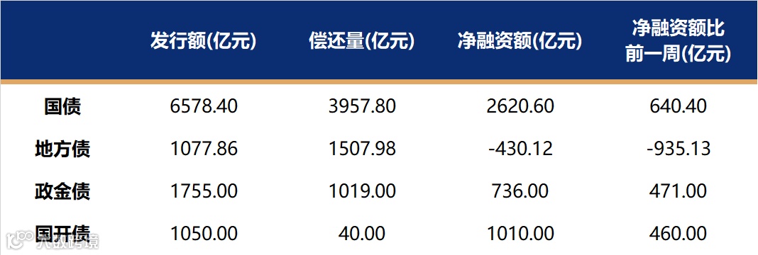 国债、国开、政金债、地方债发行量、偿还量、净融资额(与前一周比较)。
