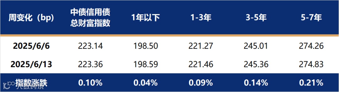 上周,信用债收益率略有下行。中债信用债总财富指数上涨0.10%,其中5-7年指数涨幅较大。