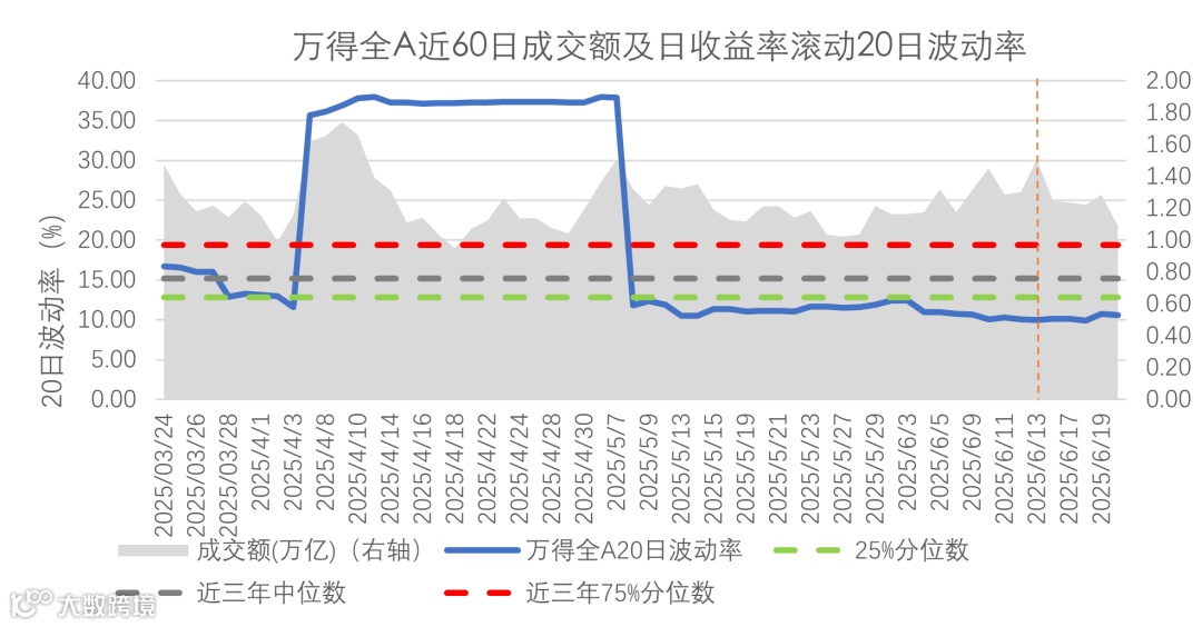 本周万得全A20日波动率处于低于近三年25%分位数,市场波动程度仍处于相对平稳的状态。成交额未现大幅起落,整体活跃度维持常规水平。说明资金没形成强方向共识,多是存量资金在板块、风格间轮动博弈,投资者风险偏好不高,观望等信号,市场在等待打破平衡的契机。