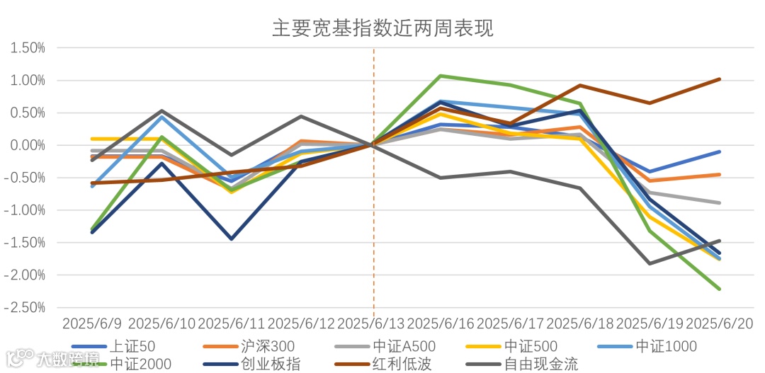 本周(2025/6/16-6/20),多数宽基指数下行,红利低波逆势上扬。上证50跌0.10%,深证成指跌1.16%,沪深300跌0.45%,中证A500跌0.89%,中证500跌1.75%,中证1000跌1.74%,中证2000跌2.22%,创业板指跌1.66%,现金流指数跌1.47%,红利低波上涨1.02%。本周市场延续分化,反映出市场避险情绪升温,资金流向高股息、低波动类资产,中小盘指数跌幅居前,或体现成长风格阶段性承压,市场结构性特征突出且偏向防御。本周调整后小盘的风险度从高位下降,正常的波动在所难免。展望后续,市场对市值风险有较为一致的预期,但需注意市场宏观环境的变化(如进出口和货币政策)导致的基本面和流动性的变化带来的影响。