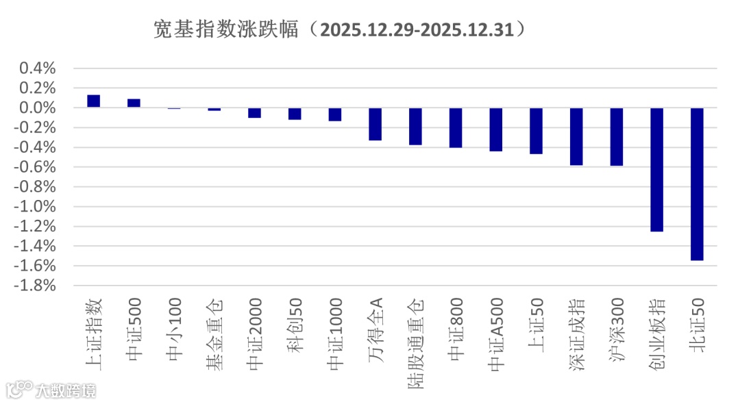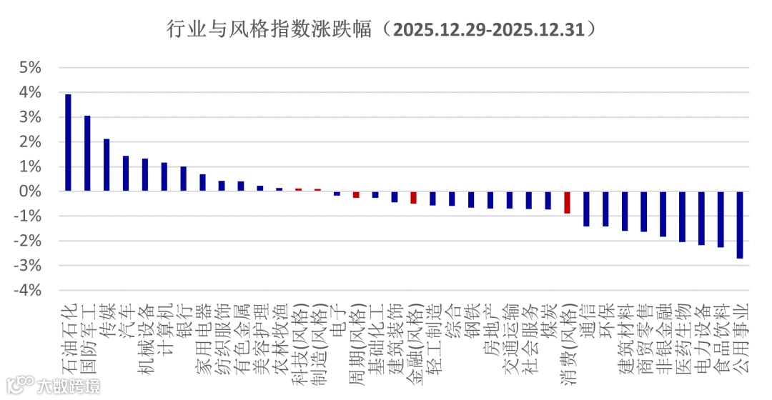 受元旦假期影响,市场中枢维稳但未能更进一步,融资余额微幅下降,市场整体资金也有流出,导致万得全A指数下跌了0.3%。上周公布的PMI数据出现超季节性的好转,但市场的反映并不明显,核心在于投资者对于2026年的政策力度的观望。元旦期间港股出现较大幅度的反弹,恒生科技指数涨幅更高,反应外资对市场的关注度仍在。A股成交放量反映投资者的分歧加大,指数下跌可以理解为资金在节前流出市场,而融资余额的稳定可以看做此类资金对后市依然看好。而这种乐观情绪,可能主要在预期春季行情。从行业指数的表现看,申万二级行业指数中的航天装备周涨幅达到15.2%、家电零部件指数上涨了8.9%,二者分别对应了商业航天和人形机器人主题,二者的表现或是春季行情的提前反映。