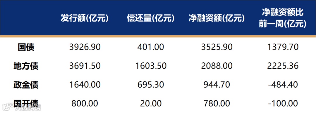 国债、国开、政金债、地方债发行量、偿还量、净融资额(与前一周比较)。