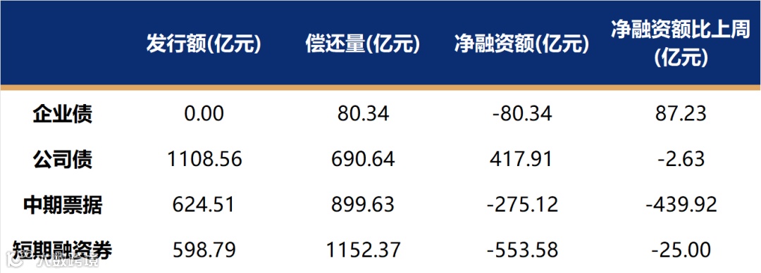 非金融企业短融、中票、企业债、公司债发行量、偿还量、净融资额(与前一周比较)。