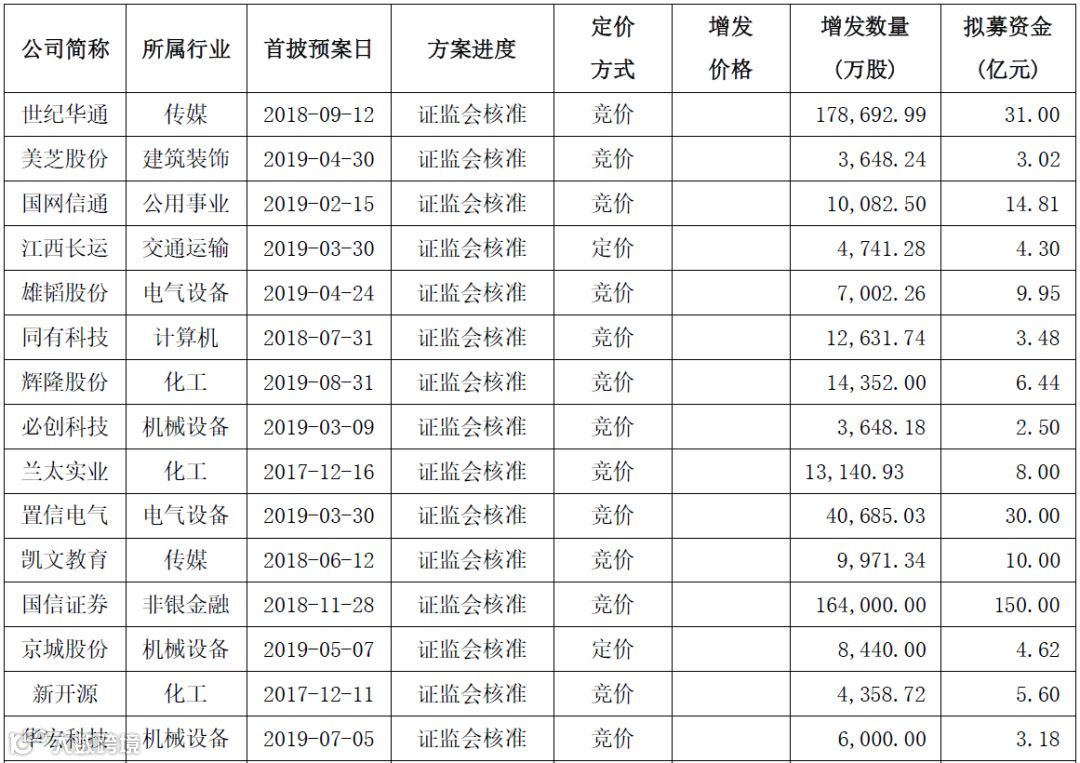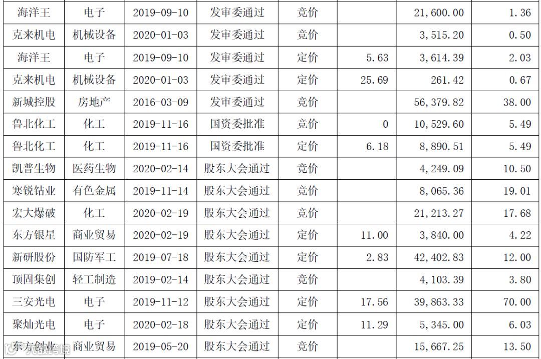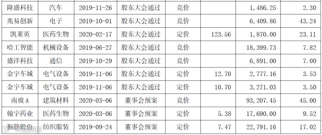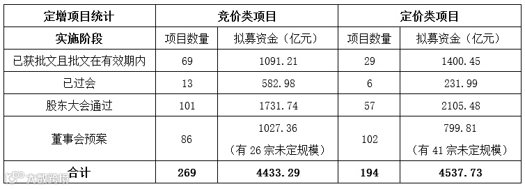 截至2020年3月6日,处于不同实施阶段的竞价类和定价类定增项目汇总如下: