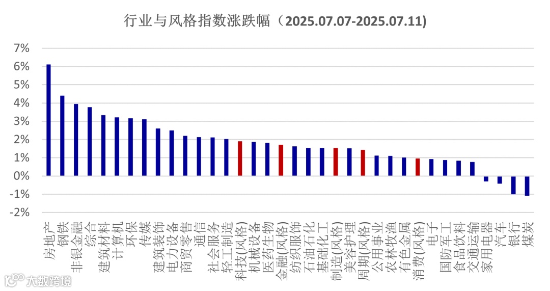政策和市场预期主导行业结构的变化。二季度房地产销售压力较大,尤其是二手房的成交均价有所下行,统计局公布的70大中城市新房与二手房价格5月份环比分别下降0.2%、0.5%,且环比降幅继续扩大,反映居民置业预期回落。在稳楼市预期之下,市场对于房地产政策继续出台的预期加大,推升上周房地产指数强势表现。反内卷主题同样反应对政策的预期,推升了钢铁、建筑材料行业指数表现强势。市场突破3500点后,市场进一步发酵乐观预期,非银金融成为带领指数向上突破的重要力量。