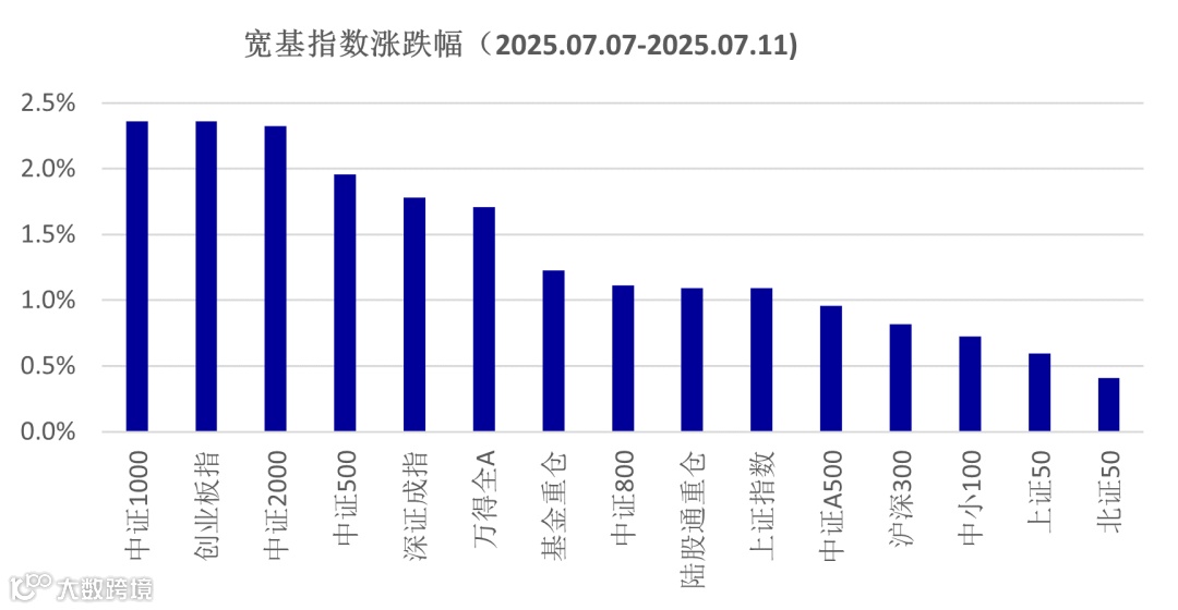 上周A股市场震荡上行,市场风险偏好持续回升,虽然有美国关税政策和国内经济数据扰动,但上证指数仍创下年内新高。市场维持大小盘轮动上涨的结构特征,上周小盘风格强于大盘风格,宽基指数中,涨幅较好的是中证1000指数和创业板指数,均上涨了2.4%,北证50和上证50指数涨幅较小,但也上涨了0.4%和0.6%。上周万得全A日均成交额小幅放大至1.50万亿。