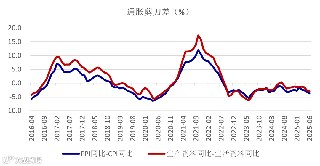 然而PPI数据继续回落,且较一季度下探幅度加深,这反映中游行业的盈利压力较大。我们从通胀剪刀差来看,无论是PPI与CPI的同比差值,还是PPI中生产资料和生活资料同比增速的差值,均是继续回落。这反映在制造业经营端,是毛利率的承压。因此,行业内卷和价格竞争仍是目前面临的重大问题。如何释放产能,匹配更好的需求,加大出海和刺激内需,是解决问题的关键,继续跟踪行业政策,关注反内卷的进程。