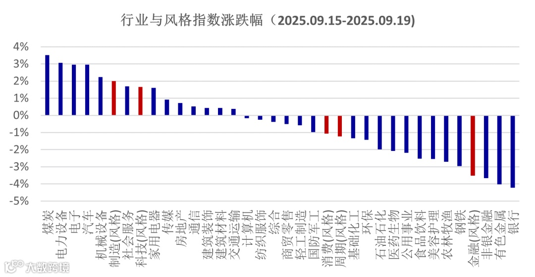 美元如期降息,市场普遍预计2025年仍有两次25bps的降息,但市场对于2026年的降息存在分歧。美联储主席鲍威尔表示,美联储预测中上调增长和通胀预测,下调失业率预测,其对就业市场下行风险的担忧升温。对国内市场的影响看,美联储降息释放了全球的流动性,这一点反应在上周恒生科技指数上涨了5.1%;同时美国经济预期上修,有利于全球需求的回暖,作为全球的主要出口国,我们经济基本面也因此受益。上周公布的宏观数据,包括投资、消费分项数据整体偏弱,但市场对此并未做出明显反应,一方面是市场的重点关注方向是TMT,与经济的相关性不大;另一方面是上半年经济高增长之后,市场对于经济下行有所预期。后续继续观望经济走向,若GDP同比增速下降超预期,则市场会进一步观望政策端的变化。
