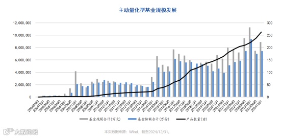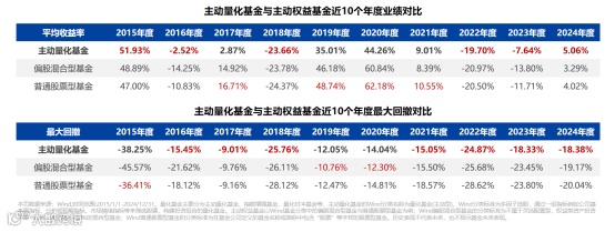 公募量化的业绩在规模上也有所体现,规模呈现波浪式前进特征。回顾发展历程,主动型量化基金曾经历两轮显著的规模扩张。第一次浪潮出现在2014年至2016年间,基金份额和规模在两年内分别实现了276.40%和381.79%的巨大增幅。进入2020年,行业迎来新一轮增长,但扩张步伐趋于稳健;截至2024年底,份额与规模的累计增幅分别为77.98%和64.47%,增速较前期放缓。