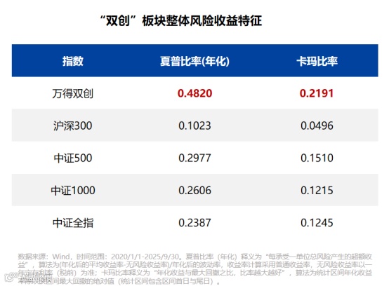此外,“双创”指数的风险收益比优异。与主流宽基指数相比,双创指数在夏普比率与卡玛比率上表现更优,体现出在控制风险的同时获取超额收益的能力。Wind数据显示,2020.1.1-2025.9.30,万得双创指数的年化夏普比率0.4820与卡玛比率0.2191高于沪深300、中证500、中证1000、中证全指指数。