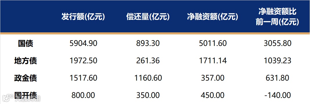 国债、国开、政金债、地方债发行量、偿还量、净融资额(与前一周比较)。