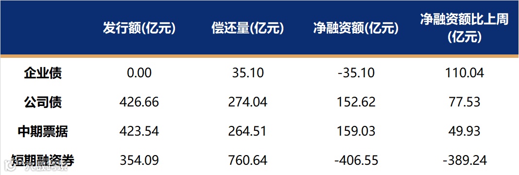非金融企业短融、中票、企业债、公司债发行量、偿还量、净融资额(与前一周比较)。