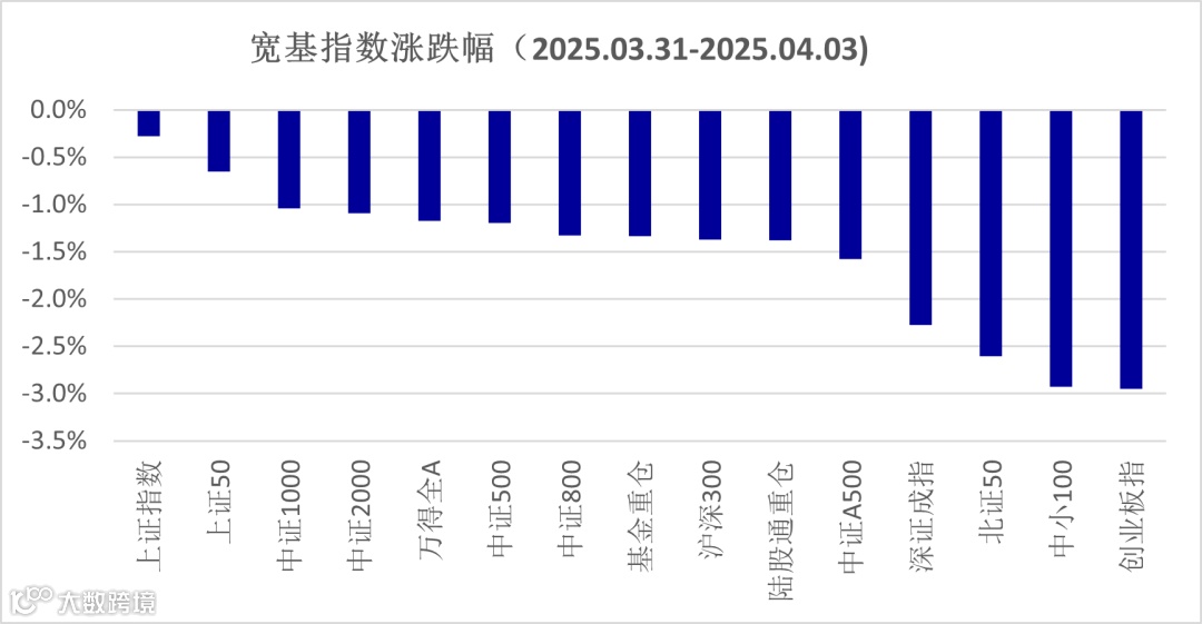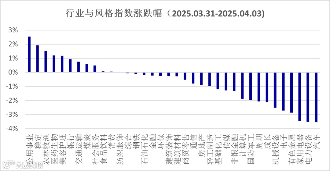 上周A股呈现震荡走势,虽然受到超预期的美国关税影响,但A股表现出极强的韧性,周四上证指数低开高走,盘中一度翻红,全天小幅下跌。但上周主要宽基指数均为下跌,上证指数和上证50指数表现较好,跌幅在1%以内,中小100指数和创业板指数跌幅较大。但值得注意的是,上周全球权益市场普跌,在关注的主要指数中,跌幅最大的是纳斯达克指数和标普500指数,跌幅分别是10.0%、9.1%,其次是日经225指数和欧元区指数,跌幅同样达到9.0%、8.5%,上证指数和沪深300指数表现最好。究其原因,是美国政府宣布的关税政策,加大了全球投资者对于经济的担忧,对美出口商品关税的税率普遍上升,对于处于复苏过程的全球经济是一种打击。