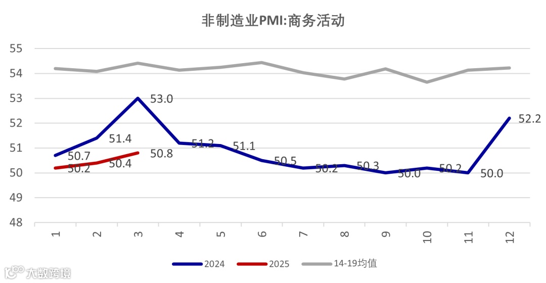非制造业PMI数据持续回升,但仍低于去年同期,建筑业PMI回升幅度最大,已经达到53.4%,但同样低于2024年3月的56.2%。综合PMI各分项数据可以看出,国内经济活动处于回升通道,但短期需求回升幅度更弱,价格承压可能在二季度延续。
