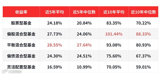 近5年与近10年不同类型基金收益情况
