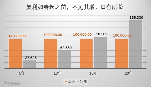 假设我们有10万元投资,按照年化收益5%计算,5年后收益为27628元;10年后收益可以超过本金的一半,为62889元;15年后投资收益达107893元,几乎与本金相同;20年后投资收益则达到本金的160%——165330元!