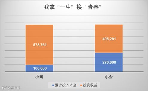 我们假设有两个好朋友,一位叫小国,从工作就开始了理财,自23岁起,每年初投资10000元,投资10年后暂停投资,靠已积累的投资继续产生收益。小金虽然为同龄人,到33岁才开始投资理财,同样每年年初投资10000元,小金想着我晚了10年,那就坚持一直投资。