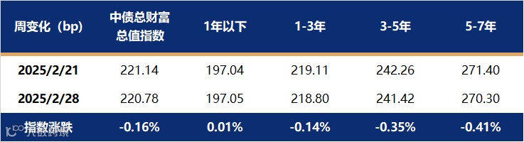 上周债市行情仍然偏弱,10年国债活跃券收益率在1.72-1.78%区间宽幅震荡,但全周收益率变化不大,短端收益率小幅上行,国开债表现明显弱于国债。上周影响债市情绪偏弱的核心原因是跨月以及政府债发行放量对银行体系流动性形成拖累,但央行对于流动性的呵护仍然谨慎,隔夜资金价格加权在2.0%附近未能有明显的下行。资金面持续2个月的紧张最终影响到长债表现,10年国债一度上行接近1.80%,“负反馈”风险抬升,该点位吸引到了配置型资金,再叠加上周五股市转弱,债市收益率冲高后有所回落。截至2月28日,1年期国债收益率报在1.4597%,较2月21日下行2.00bp;10年国债收益率报在1.7152%,较2月21日下行0.48bp。中债总财富指数下跌0.21%,其中7-10年跌幅相对较大。