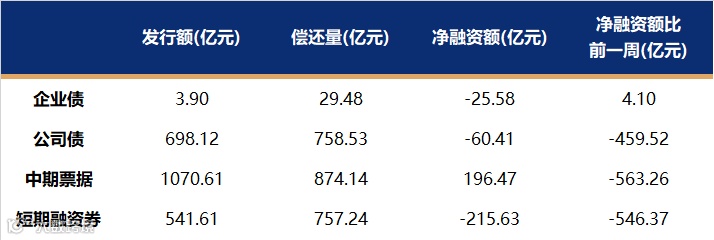 非金融企业短融、中票、企业债、公司债发行量、偿还量、净融资额(与前一周比较)