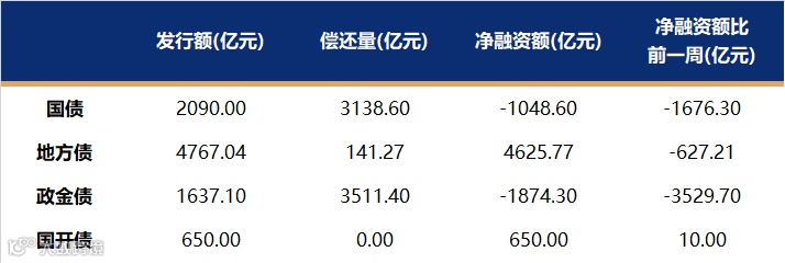 国债、国开、政金债、地方债发行量、偿还量、净融资额(与前一周比较)。