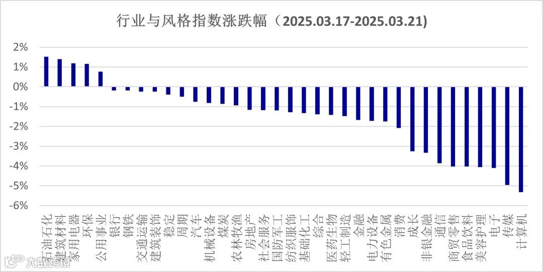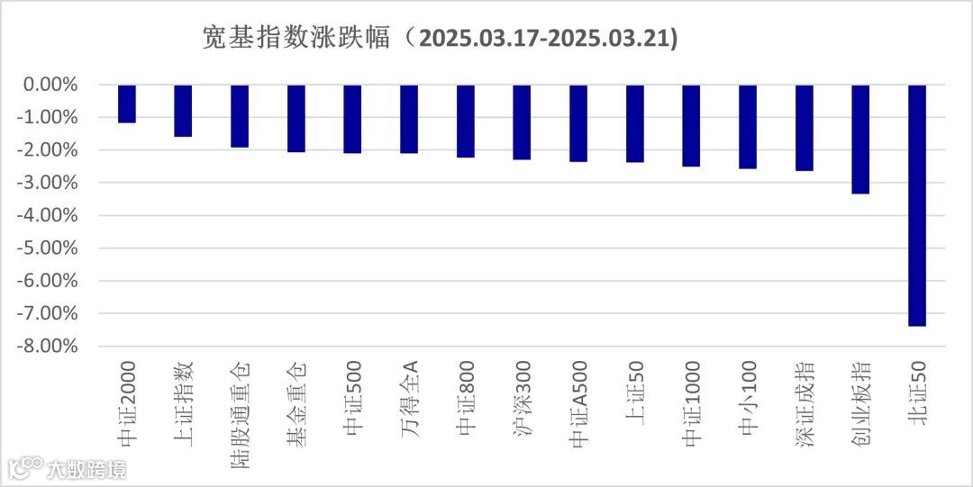 上周A股前半周整体震荡,周五则低开低走,全天上证综指下跌1.29%,万得全A下跌1.67%,小盘股跌幅更大,北证50指数下跌4.17%,在此影响下,宽基指数全面收跌,万得全A一周下跌2.10%,北证50指数跌幅为7.39%。年初以来,尤其是二月份实现呈现小盘股强势的风格,但进入三月份后,风格更加均衡,政策和业绩的边际影响加重,市场后续会进入年报和季报集中披露阶段,预计业绩对市场的定价能力增强,净利润增速稳定的消费和部分科技股有望占优。上周A股市场成交量进一步下降,万得全A指数的日均成交额为1.55万亿。