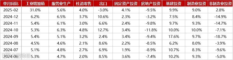 上周统计局公布的2025年2月的经济数据,整体符合预期,分项目看,生产好于需求,内需好于外需。生产相关的分项,例如工业增加值、服务业生产,均好于预期,且明显高于名义经济增速。出口出现较大幅度的回落,综合1、2月份的出口,较去年四季度也有所下滑。预计这是受到前期抢出口的影响,后续随着对美出口关税增加的影响,出口预期需要进一步下调,四月份美国对贸易的审查,会有更详细的关税政策,届时需要再评估外需的变化。