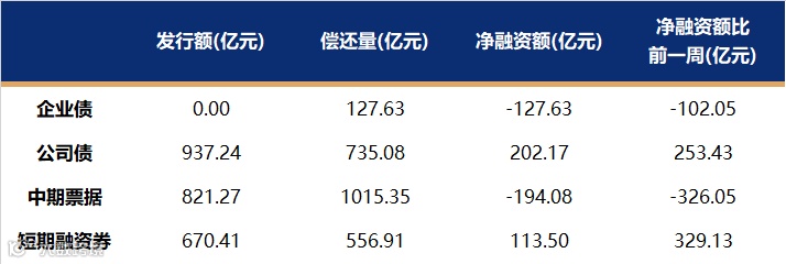 非金融企业短融、中票、企业债、公司债发行量、偿还量、净融资额(与前一周比较)