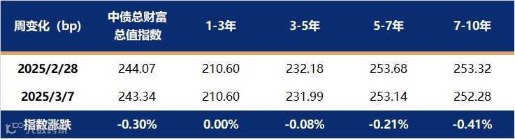 上周债市出现较大幅度的调整,国债长短端上行6-10bp不等,国开债的表现略强于国债,国开债中短端上行幅度较小。上周影响债市情绪偏弱的原因有二,一是月初资金面大幅转松,但大行的隔夜融出价格仍然不低于1.80%,表明了当前政策层对流动性的态度仍然较为谨慎。二是央行行长在人大记者会强调结构性货币政策以及关注利率风险,债市对降息预期减弱。截至3月7日,1年期国债收益率报在1.5547%,较2月28日上行9.50bp;10年国债收益率报在1.8002%,较2月28日上行8.50bp。中债总财富指数下跌0.30%,其中7-10年跌幅相对较大。