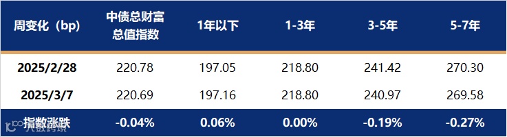 上周,信用债收益率全面上行。中债信用债总财富指数微跌0.04%,其中5-7年指数跌幅较大。