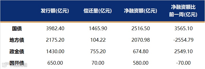 国债、国开、政金债、地方债发行量、偿还量、净融资额(与前一周比较)。