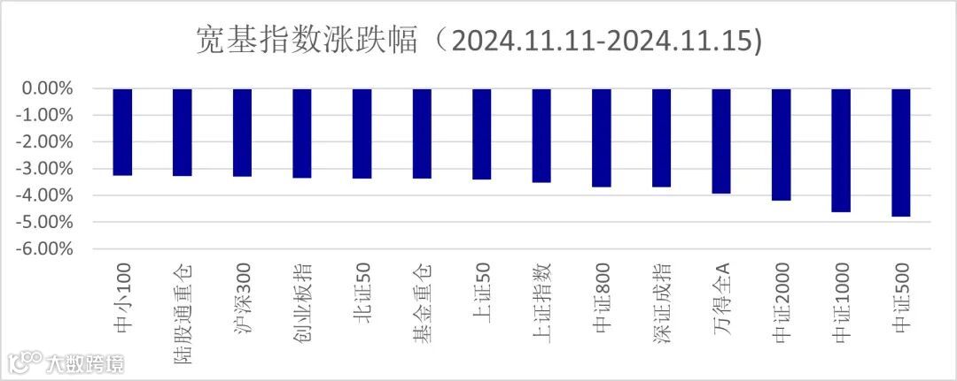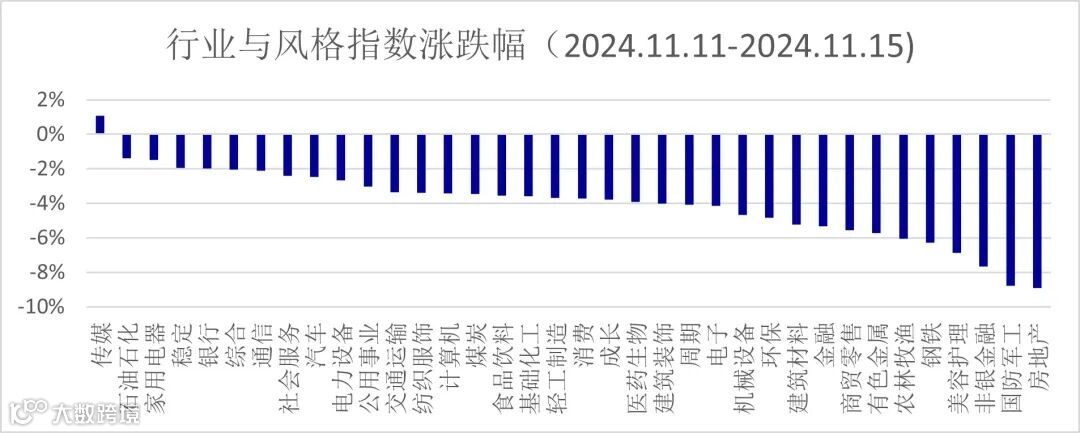 上周市场的回落,主要是乐观情绪的消退和市场预期的变化。随着美国大选的落幕,市场对于特朗普再次当选后的政策开始担忧,我们可以观察到汇率和港股市场也面临较大的调整。然而,对A股市场影响更为重要的是国内经济情况,10月份的经济数据表明,随着财政的发力和刺激效果的显现,消费开始回升,投资保持稳定,PMI和进出口数据反应市场需求在温和复苏,随着财政支出和化债政策的落地,四季度的经济数据有望逐步回暖,或将利好国内的资本市场。