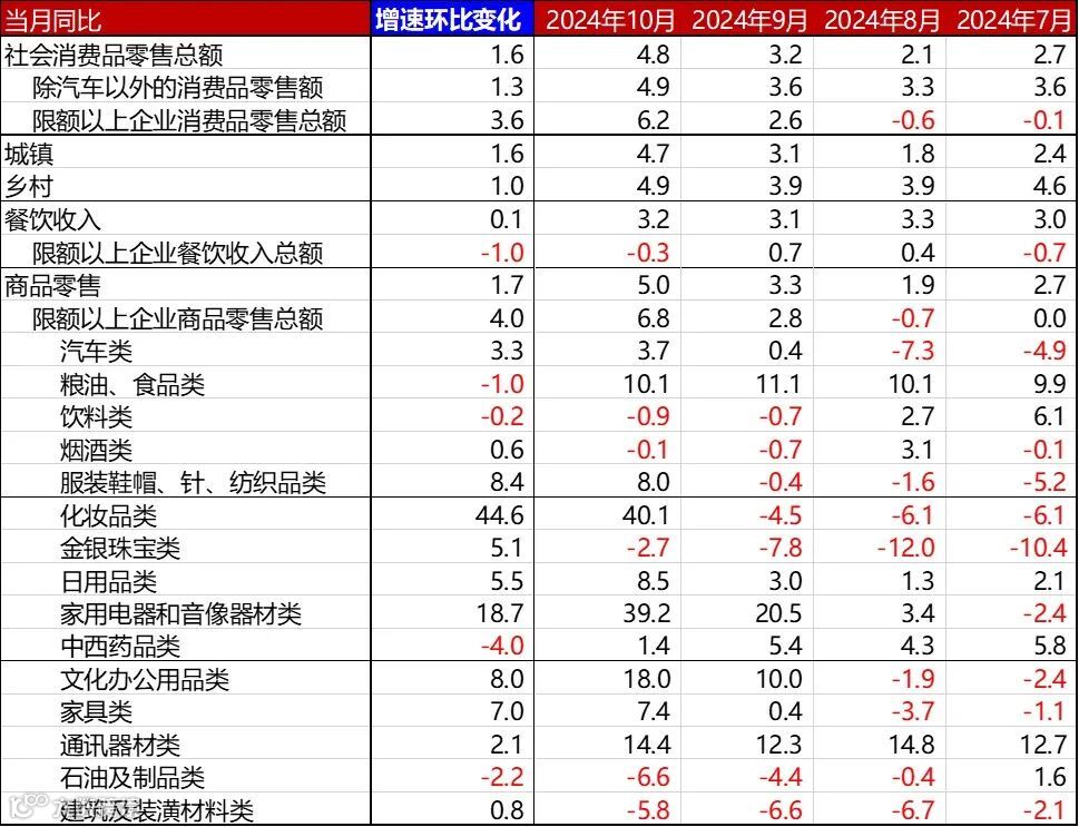 消费品零售总额呈现出整体回暖,1-10月的消费品累计增速为3.5%,较前九月3.3%的增速进一步回升,月度零售总额的增速回升更为明显。从分项数据看,10月同比增速改善最大的是化妆品类,预计与“双十一”预售有关。其次,家用电器类,预计与“以旧换新”消费刺激政策相关。
