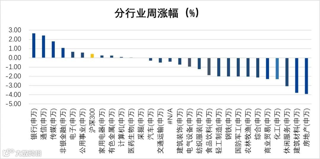 进入8月第三个交易周,市场整体较前一周持平。两市成交金额周均下跌至5,294.40亿元,北向资金周净流入17.39亿元,两融余额14,177.60亿元。截至上周五收盘,上证综指周涨0.60%,收于2,879.43点,深证成指周跌0.52%,收于8,349.87点,沪深300周涨0.42%,收于3,345.63点,创业板指周跌0.26%,收于1,591.46点。各行业(申万一级行业,下同)来看,银行、通信、传媒涨幅居前,分别为2.66%、2.42%、1.80%;房地产、建筑材料、休闲服务跌幅居前,分别为-3.91%、-3.79%、-3.08%。
