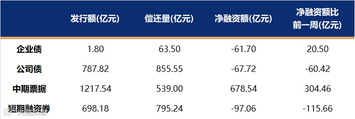 非金融企业短融、中票、企业债、公司债发行量、偿还量、净融资额(与前一周比较)