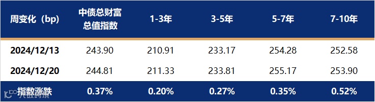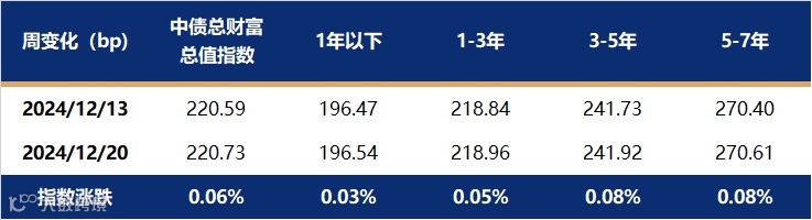 上周利率债各期限收益率均大幅下行,10年国债下行至1.70%重要关口,1年国债收益率下破1.00%,短端下行幅度大于长端,曲线由平转陡。影响全周债市走强的主要原因是税期过后资金面转松,带动短端利率走强。此外,央行调研本轮债市行情中部分交易激进金融机构,对长端利率债形成扰动,但在配置盘推动下,长端利率调整后继续下行。截至12月20日,1年期国债收益率报在0.9807%,较12月13日下行17.75bp;10年国债收益率报在1.7018%,较12月13日下行7.53bp。中债总财富指数上涨0.37%,涨幅较前一周明显放缓,其中7-10年指数涨幅相对较大。