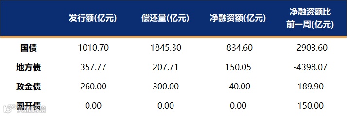国债、国开、政金债、地方债发行量、偿还量、净融资额(与前一周比较)。